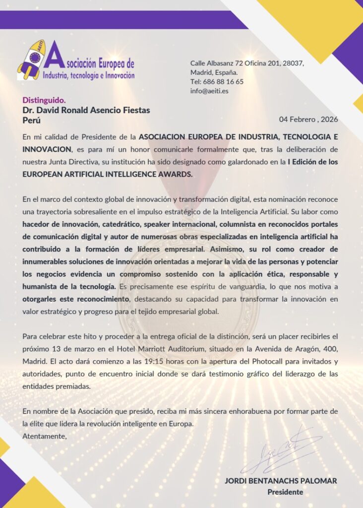 The nomination for the European Artificial Intelligence Awards symbolizes years of sustained work in innovation, training, and technological leadership. Moving from Peru to the world stage, his approach has successfully positioned itself in academic, business, and governmental spaces, contributing to the construction of a more conscious and responsible digital ecosystem.